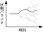 この移動には上記の非決定性がはたらくであろう.すなわち,つぎの安定状態にいたる システムの軌道が分岐 (bifurcate) していて,どちらの軌道が選択されるかはゆらぎやラ ンダムネスやその他の微小な原因によって左右される (これらの原因に対する正のフィー ドバックがはたらく) ため,あらかじめ予測できない [Pri 87 など] [*16][*17].このよう な現象は,物理系などにおいては (自発的な) ``対称性のやぶれ'' とよばれる [Pri 84].分岐 は,おおくのばあい,図 2.1 のようにカスケードをなしている [*18].自己組織系における このような軌道の選択は,非決定的であるために自発的であるようにみえる.すなわち, システムは自由に選択をおこなっているようにみえる.このように要素が自律的に動作す るということは,システムが機械論的ではなく有機論的であることを意味する [*19].