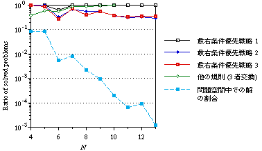 この図には,前記のプログラムにおける条件の出現順をかえて最右条件優先戦略のもとで もとめた確率 (スケジュリング戦略 1 〜 3) と,前記のとはことなる規則 (3 者交換規則) を つかってもとめた確率とをあわせてしめした.初期配置はランダムにきめた.また,この 図にはクウィーンのランダムな配置を生成したときにそれが解になっている確率 (問題空 間中での解の割合) をもあわせてしめした.
