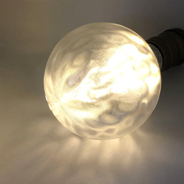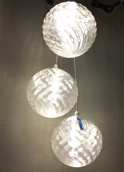 球形にちかいかたちのシェードは以前からフィラメントの過不足がないようにつくれましたが,彫りの深いかたちは赤道ちかくで穴があいたり,極ちかくで余ったりしがちでした. 最近のソフトウェア改善でこうした問題がほぼ解消されたので,おすすめです: 「深い模様をつけた 3D デザインランプ」. 写真は試作品なので製品はもっときれいにつくれます.