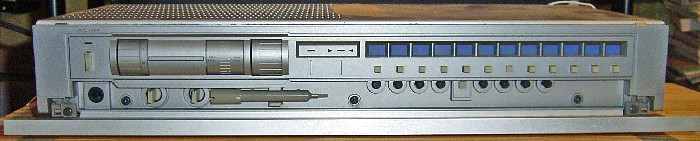 B 級マニアだった私はよくバーゲンで買い物をしましたが,このレシーバーもそうしたものです. 1 万円台だったと記憶しています. 当時としては比較的めずらしいプリセット型のチューナーをそなえています. 現在のチューナーでは選局は自動ですが,このときは自動選局などという気のきいたしかけはなかったので,あらかじめ 1 局ずつ手動で選局しなければなりません. 選局するときはパネルをあけて,各プリセットボタンの下にあるツマミを付属のドライバーでまわします (写真参照). 安価なレシーバーですからシグナル・メーターはついていませんが,チューニング用に 3 つのランプがついていて,どちらにまわせば同調するかがガイドされ,同調すると中央のランプがつくようになっています.