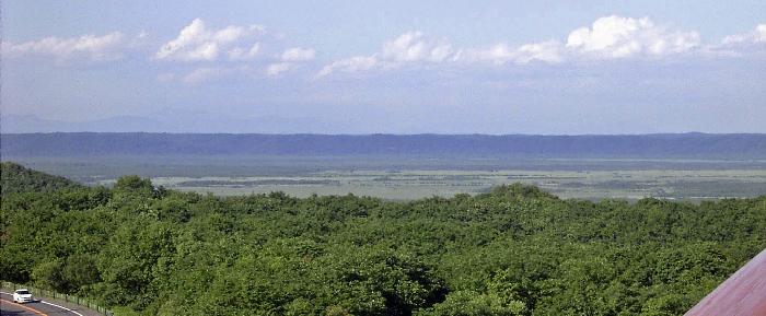 そういうわけで,このあとは湿原の西側にもどって,湿原があまりよくみえない道をすすむことになりました. それでも,しばらくいくと湿原展望台というものがあります. のぼってみましたが,湿原らしい風景はあまりよくみえません. とおくにかすかにみえる湿原を写真にとってみました. 双眼鏡をもっていれば,ここからでももうすこし湿原をよくみることができたでしょう. 双眼鏡を買ってもっているのですが,旅行のときにはいつもほかのことに気をとられて,もってくるのをわすれてしまいます.