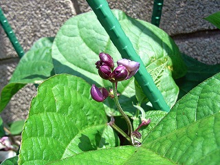 なかなか苗をそだてられなかったインゲンがいまでは元気になり,ようやく花をつけるところまできた. 「パープルインゲン」 という名のとおり,紫色の花がさいている (さすがに実が紫色ということはないだろうが). そして,さきおわった花にはちいさな実がついている.