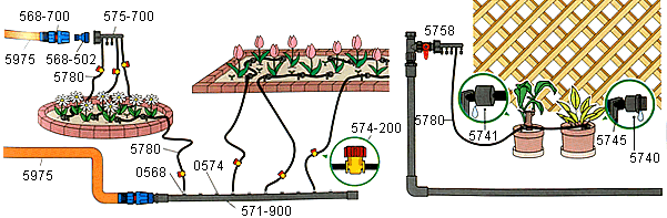 水道管直結にすれば定期的に水をやるのは容易だ. そのためのしかけそのものはそれほど高価ではない. カクダイの マカロニホース はさまざまな部品をあわせて使用することによって,おおくのプランターに給水することができる (下図). 高価ではないといっても,ひとつひとつの部品 (ホース, 滴下エンド, 滴下ニップル, ミニチーズなど) が 1 個あたり 50 円 ~ 200 円くらいするので,それらをプランターの数だけ (10 個くらいずつ) そろえると,5000 円くらいはかかる. 10 個くらいというのは地面においた中型のプランターのことであり,壁にかけた個小型のプランターには,いまのところ,つかっていない. その理由は,プランターの地面からのたかさがまちまちでうまく給水できないとかんがえられたことと,100 円のプランターのために何百円もかけるのはバランスがわるいとかんがえたことだ.
