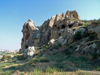 4:00 am におきて熱気球にのるという選択肢もあったようだ (写真参照) が,地上から観光することをえらんだ. Openair Museum なるものにむかったみることにした. Google Map をたよりに,そちらの方向にむかっていった. . いろいろな奇岩をみつつ,写真をとりつつ,道をあるいていった.