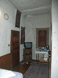 ホテルはとんがり帽子形の岩をくりぬいてつくった部屋だが,2 階建ての 2 階だった. シャワーだけだが,私にはこれで十分だ. これで 45 ユーロ (105 リラ) だという. 下には客はいないようだった.
