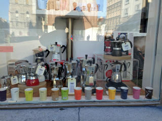 ここからすこし北にむかっていく. このあたりにはレストランのほか,さまざまなみせがある. コーヒーの器具やカップの店のショーウィンドウをうつしてみた.
