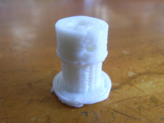 最初は歯をほそめに (0.75 mm) して,ノッチも浅く (0.51 mm) してみたが,そうしてつくった STL ファイル (これは正常) を Skeinforge でスライスしてみると,歯がきえてしまう (左下の写真). GCode ファイルをみても歯がないことがわかった. 0.4 mm のフィラメントではこのかたちをつくるのは無理ということだ.