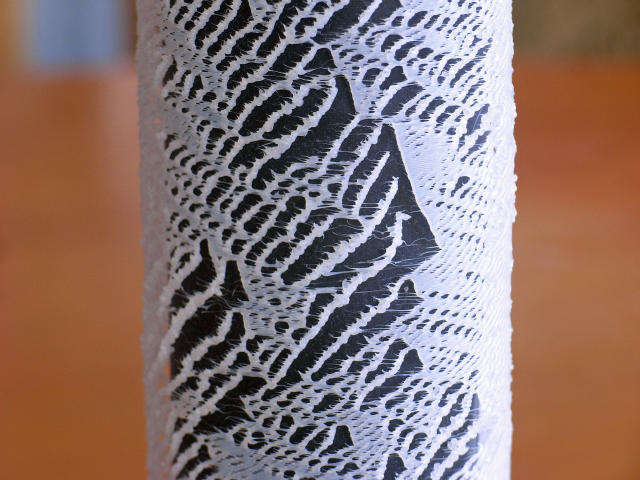空白を持続的につくりだすには,すこしくふうがいる. 下の写真はヘッドで (円ではなく) 6 角形をえがきながら印刷しているが,頂点のあいだは最高速にちかいはやさ (5000 mm/min 以上) で移動させている. こうすると,パターンは疎になり,空白ができる. その空白部分に 6 角形の頂点から左上にむかって 80° 以上の急角度でパターンが成長していく. ただし,この条件ではあまりその成長はながつづきしない.