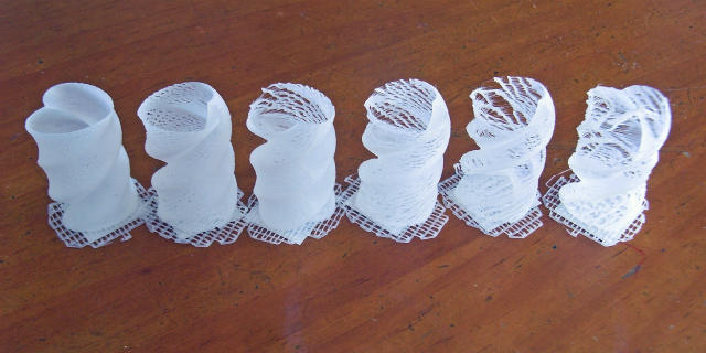 先々週は PLA によるハート形 “花瓶” の印刷をこころみたが,今度は ABS でためしてみた. 1 層できれいに印刷できるパラメタをみつけるのがすこしむずかしかったが,層厚 0.15 mm で花瓶のサイズがもとの 35% という値の (つまりとてもちいさくした) ときにきれいに印刷できることがわかった. フィラメントの量をいろいろかえて印刷してみた.