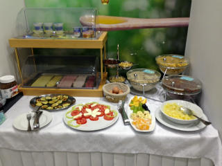 料金にはいっている朝食には卵料理やソーセージ,ハム,チーズ,そしてホテルでつくったらしいクレープや菓子などもある.