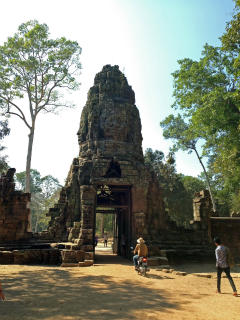 つぎはプリヤ・カーンだ. そこにいきつくまでに,まず,きのうきたアンコール・トムの一部をとおっていたった. 左下の写真はその東門だ.