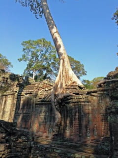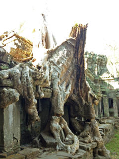 タ・プロムは塀にかこまれているが,TukTuk はその外にとまる. 東側からはいり,西側にぬけた.寺のあとにおおきな木がはえ,建物にたくさんの木がからみついているところに特徴がある. それほどひろくはないが,TukTuk をおりたところからは数分あるいた.