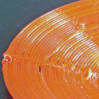 こうやって印刷した結果を写真にとった. 最初の写真は Skeinforge で層厚 0.15 mm (フィラメントの直径が 0.6 mm 弱) の皿をスライスしたときのものだ. Dimension > Filament packing density は 0.25 にしている. フィラメントはほぼ各層ひとまきずつになっているが,ヘッドがフィラメントのすきまをうめるようなうごきをする. 底面は非常にきれいにできているが,その周囲はすこしフィラメントがあまりぎみだ. 底面では 1 倍でよいはずのフィラメントを 4 倍射出しているので,きれいにできるのがむしろふしぎだ.