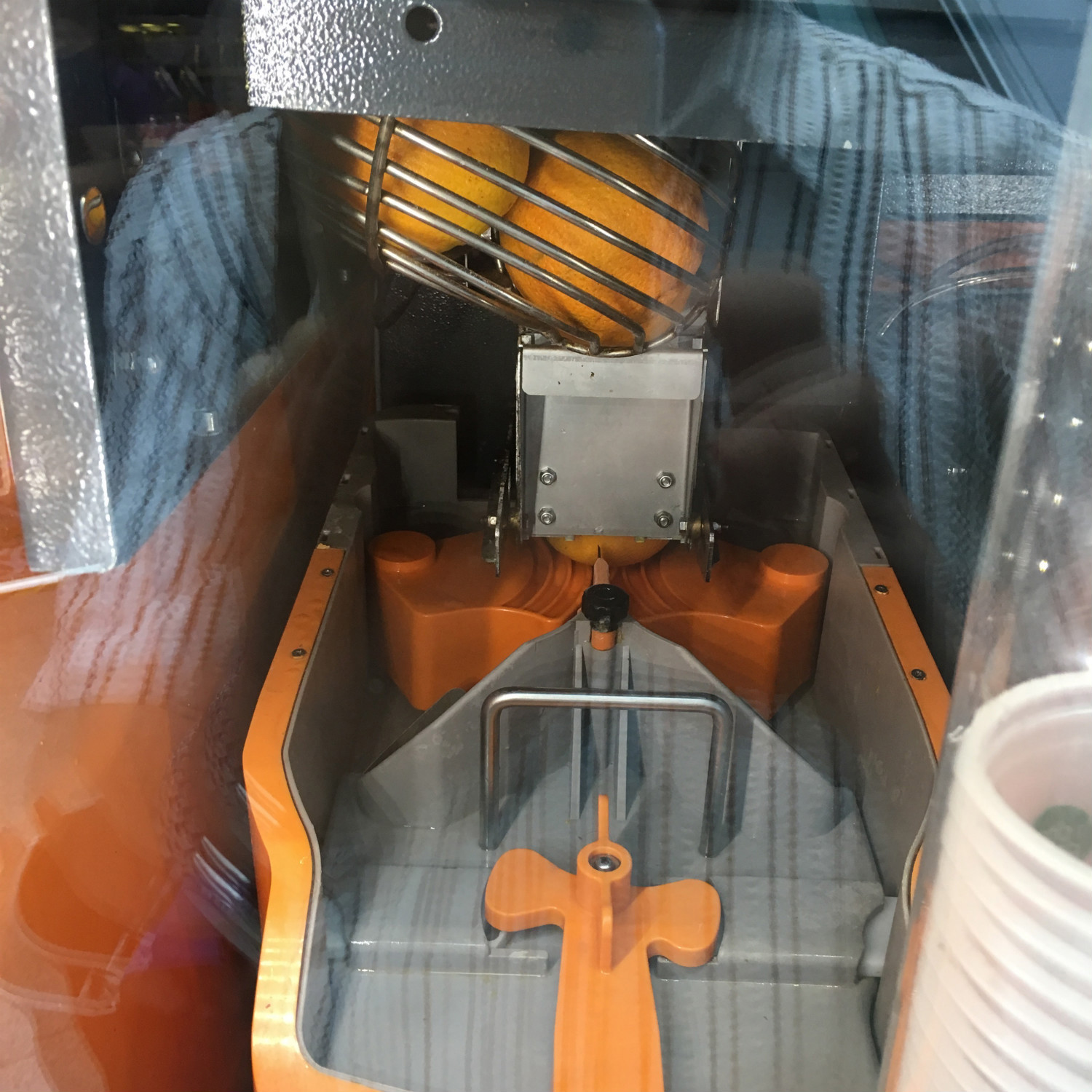 华强广场の入口ちかくにオレンジジュースの自動販売機があった. オレンジをその場でしぼって販売するというので,ためしてみた. 2 番めの写真のように上にオレンジがはいっていて,3 番めの写真のようにそれがおりてきて,しぼられる (しぼっているところはみえない). 何個かしぼって,やっとカップ 1 杯のジュースがでてきた. これで 10 元. 濃縮還元なら 1 リットル買える値段だから,あまりこの機械をつかうひとはいないのだろう.