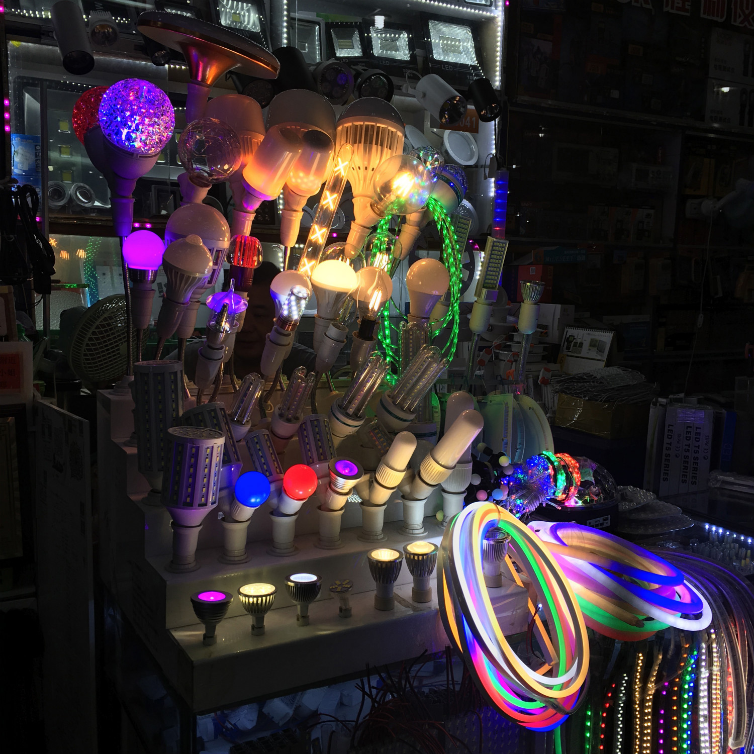 ホテルを通る地下鉄 2 号線の通りの南側も北側と同様にスマホばかりのビルがめだつ. ビル中の店がスマホ・ケースばかり売っているのは目がくらむ. ケースをつかわない私にはなんの興味もない. そのなかにすこしは USB メモリやメモリ・カードの店がある. Olympus でとった写真を MacBook でみるにはカード・リーダが必要だが,もってくるのをわすれたし,最近は紛失して不足していたので,ここらで売っていれば買おうとおもった. しかし,あまり売っていそうな店がない. こういう店のなかでもすこしは興味をひくものがあった. 何枚か写真をのせる. 2 枚め以降の写真は商品ではなくて,フィラメント電球をつかっているところに注目して,うつした. しかし,iPhone でうつしても,にじんでしまってフィラメント電球であることがわからない.