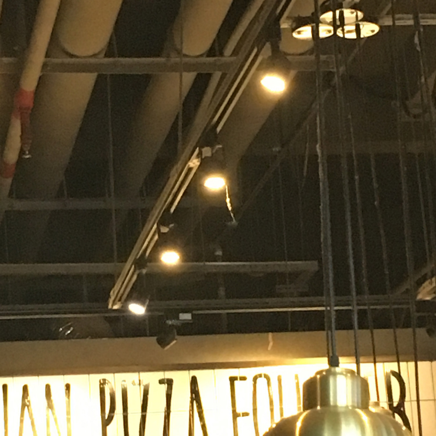 つぎの写真はほかのビルでみた店舗の照明だ. これらもフィラメント電球なのだが,写真ではわからない.