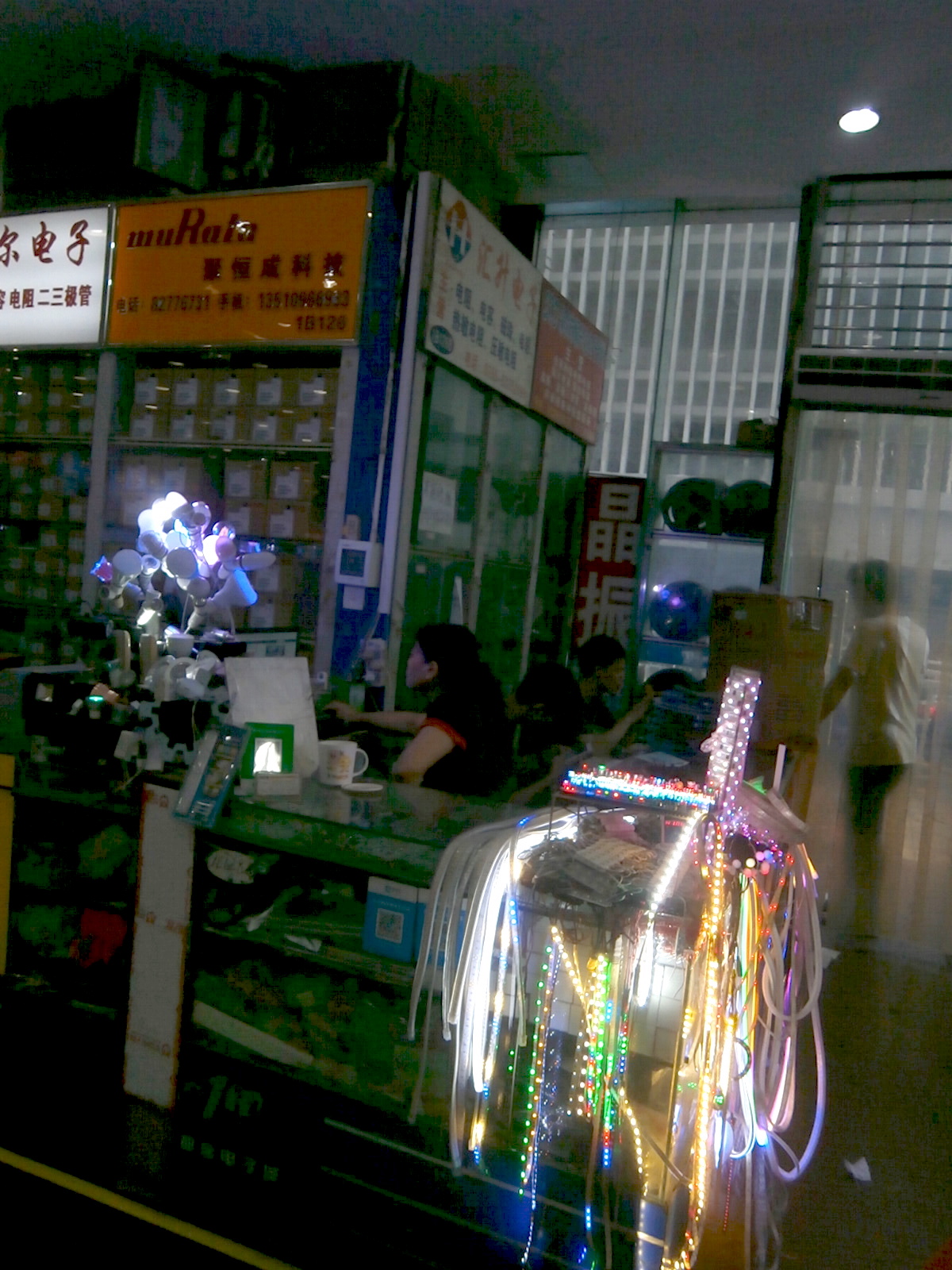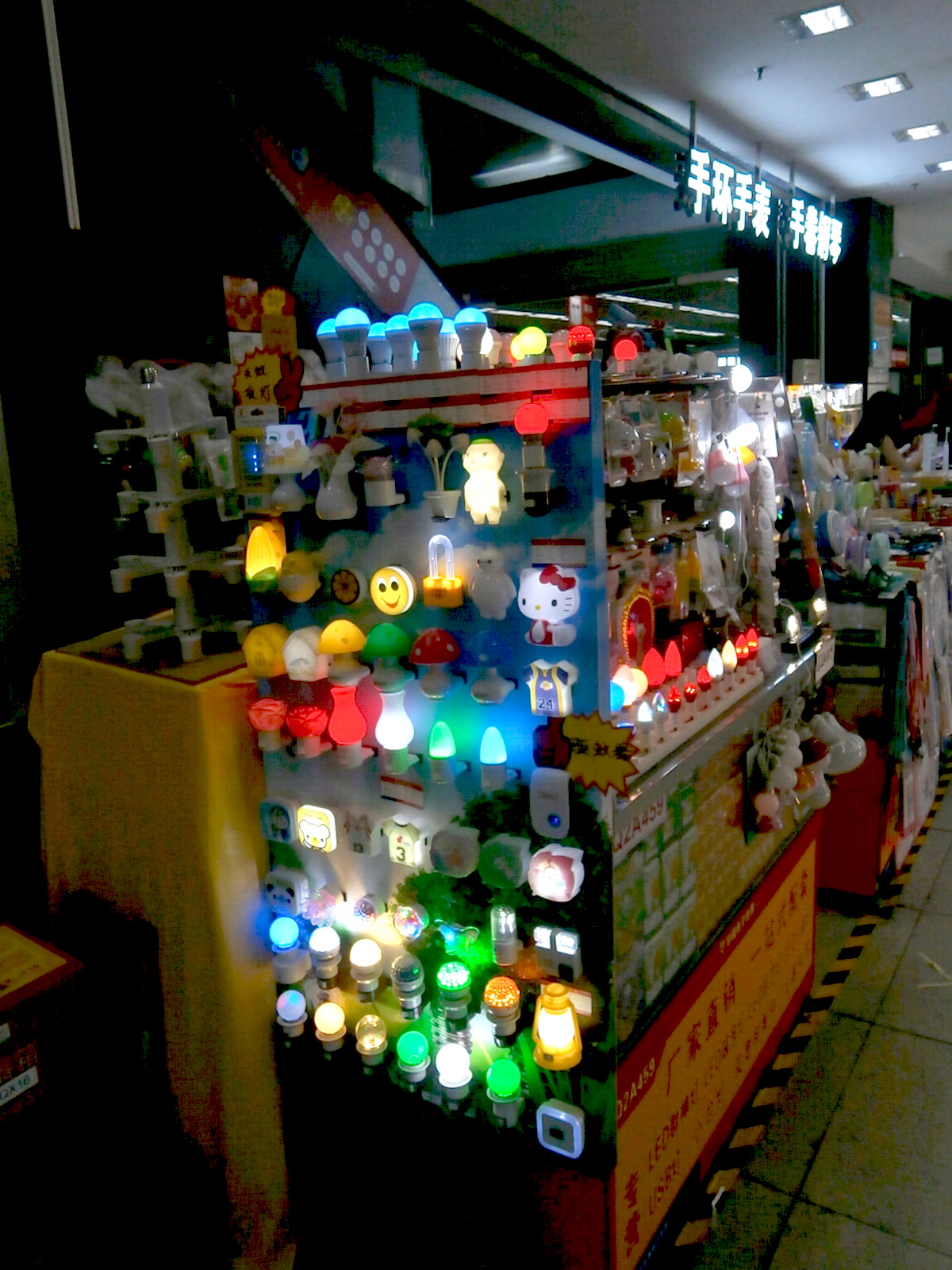 深圳にきて 4 日めに LED 屋があつまっているビルのなかで写真をとりまくった. その大半をここにのせる. テープライトはさまざまあるが,電球のかたちをしたものでめだつのは,フィラメント形の LED をいれたものとストリング状の LED をいれたものだ. フィラメントのほうは実用的なあかるさにできる (それでも通常は白熱電球 40 W 相当以下) が,ストリングは白熱電球 20 W 相当以下なので装飾用だ. 装飾用の需要がつよいことをものがたっている.