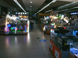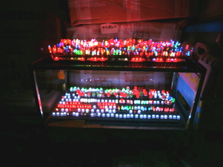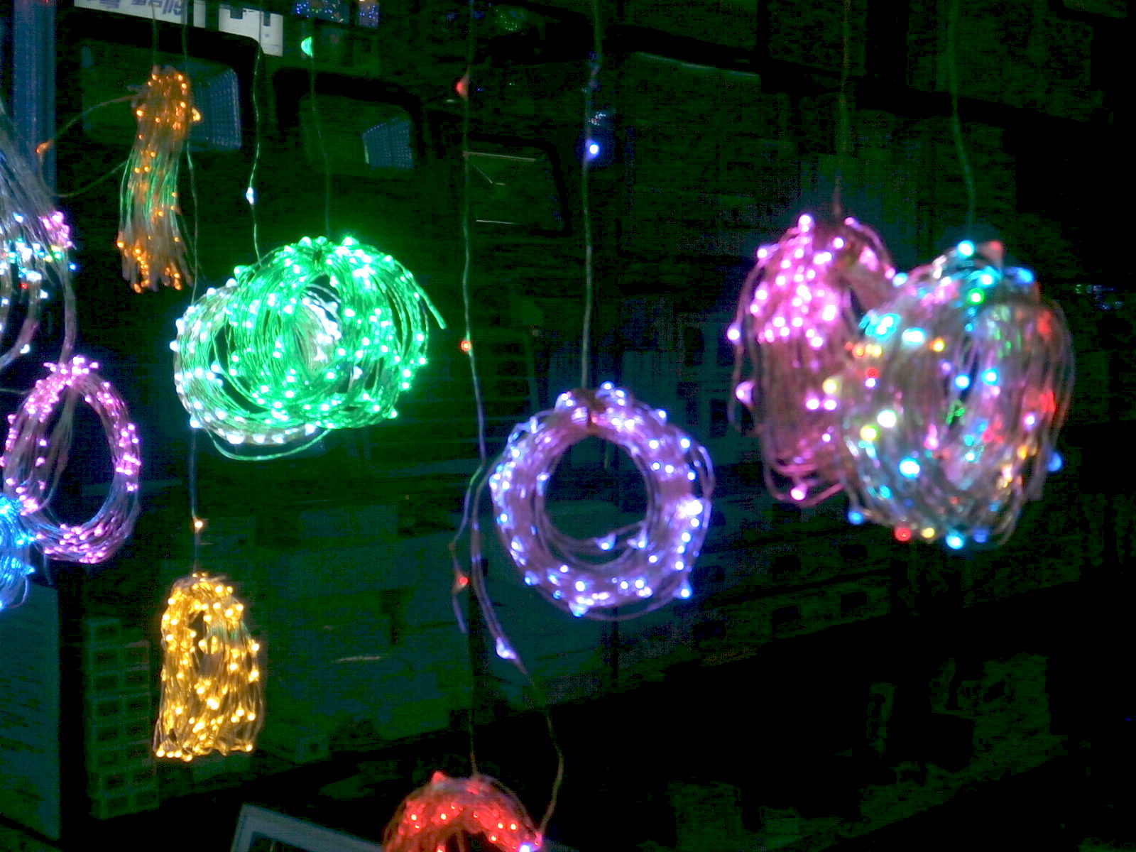 2 日めにもみた LED 屋がはいったビルに,たまたまはいってしまった. おとといは写真がうまくとれていないので,この機会に写真をとりなおそうとおもって,再度このビルをまわった. 2 日めには iPhone をつかったのだが,うまく写真がとれなかったので,きょうは Olympus のカメラをためしてみる. ふつうにうつすと LED 光源をうつすにはあかるすぎるので,露出補正を −2 (最低値) にしてみた. 大半の写真はうつしたあと露出補正しているが,それだけでは周囲がほとんどまっくらになるので,一部の写真はさらにガンマ補正している. しかし,それでも目でみた感じとはちがう. 目でみた感じにちかづけるには,さらに高度な補正が必要だ.