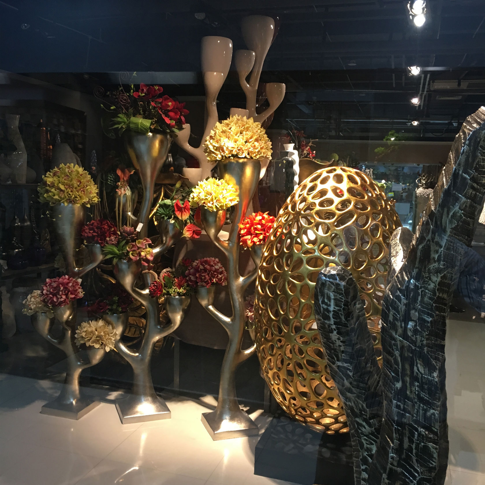 そろそろ照明屋のビルにいこうとおもったが,石屋のビルの地下と 4 階をみていないことに気づいて,そこを経由していくことにした. 4 階には石だけでなく各種のおおきな装飾品がある. 植物もいろいろある.