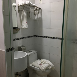 シャワーはカーテンもなく水がバスルーム全体にながれていくようになっているのが,いささかつかいにくい. ものをおく場所もすくなくて,おとしやすいのがすこしこまるが,これは安ホテルにはありがちなことだ.