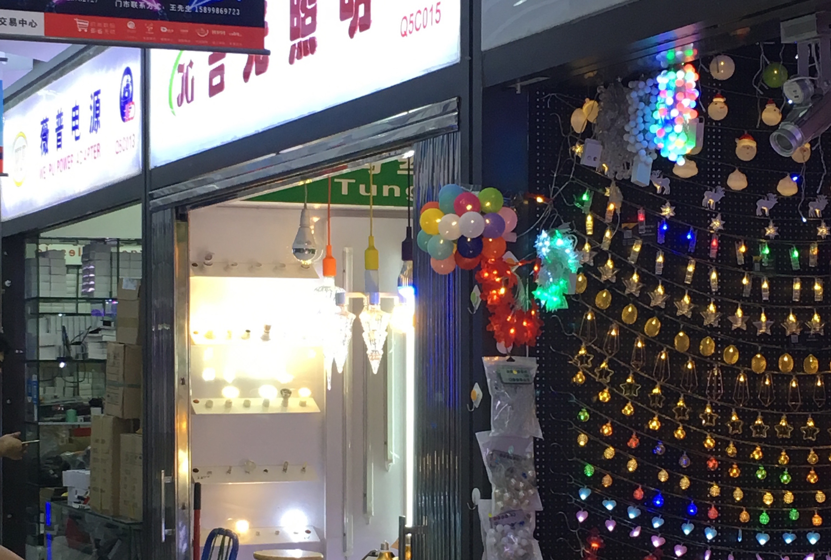 日本でも展示会などでみかける,USB や 12 V の電源でエナメル線についた LED をひからせるような "電球" がめだつ. LED の色も日本人は電球色・白色以外あまり買わないが,色物が中心の店が多い. 日本ではこういう装飾的なものは売れにくいようにおもうのだが,もっと売れている場所があるのだろう. 中国人が色の変化する LED を好むことは,学会のバンケット会場などでも経験している.